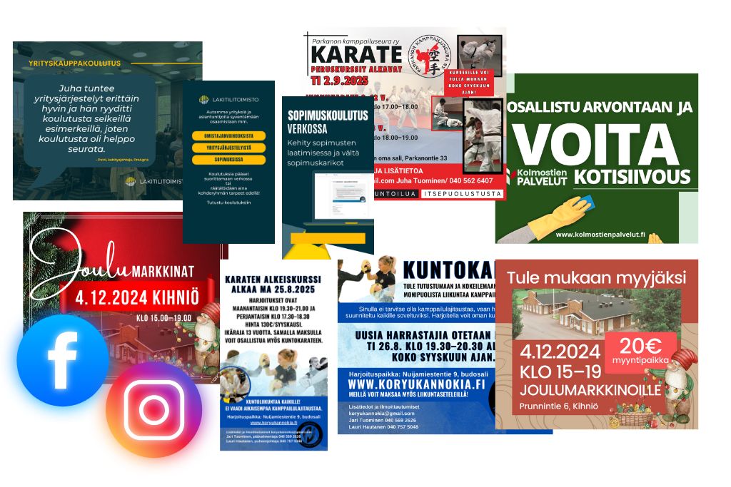 Olipa kyseessä pieni kylätapahtuma, yhdistyksen kevätmarkkinat tai suuret messut, meiltä saat markkinointimateriaalit valmiiksi painoa ja käyttöä varten.